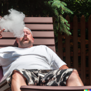DALL·E 2023-03-13 10.21.52 – Man sitting in a deck chair, outside enjoying smoking a joint with a small cloud of smoke around him